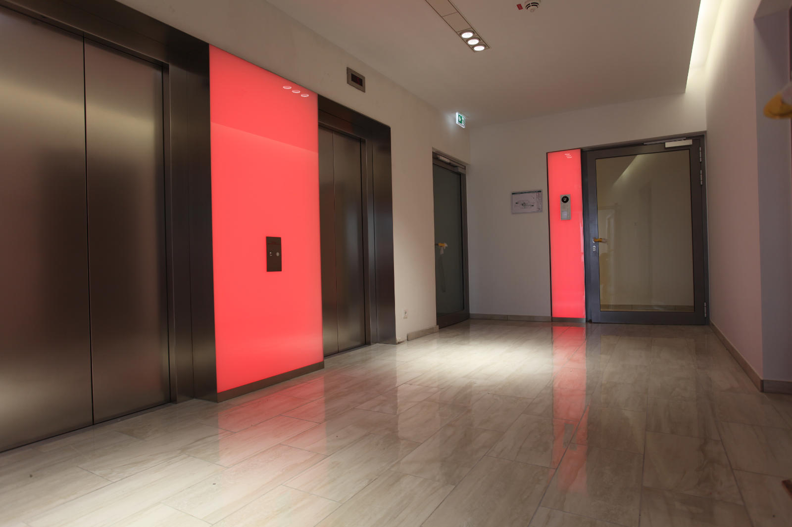 mit Multicolour RGBW Lichtwände mit Glas zur Fahrstuhlverkleidung in Düsseldorf.